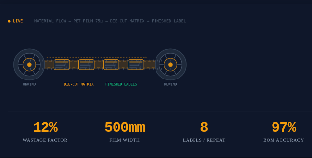 Built for label and flexible packaging converters who are tired of costing jobs on spreadsheets. Optrical SmartFlow Manufacturing handles film math, die-cut waste, and shop floor execution — from quote to invoice.
